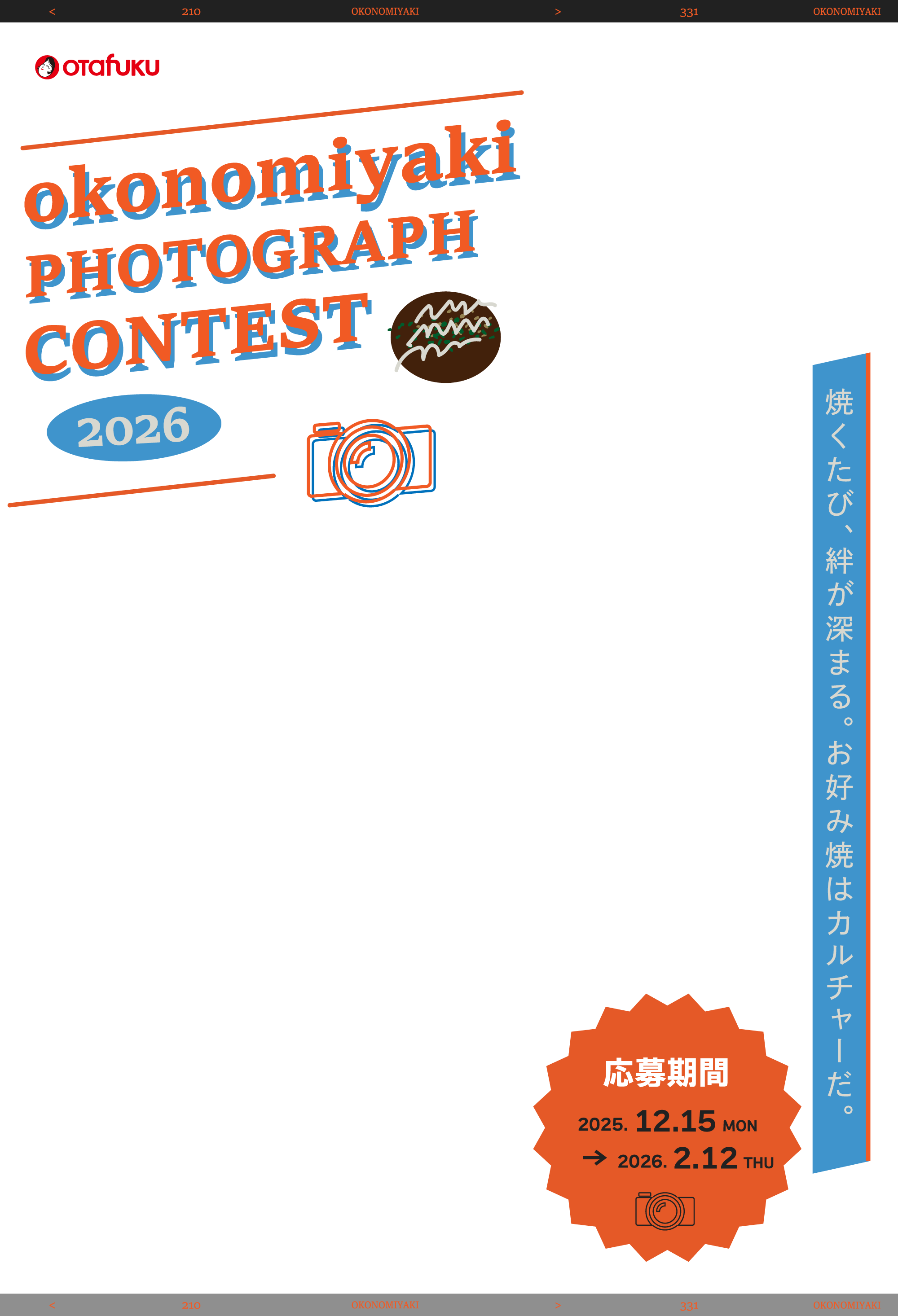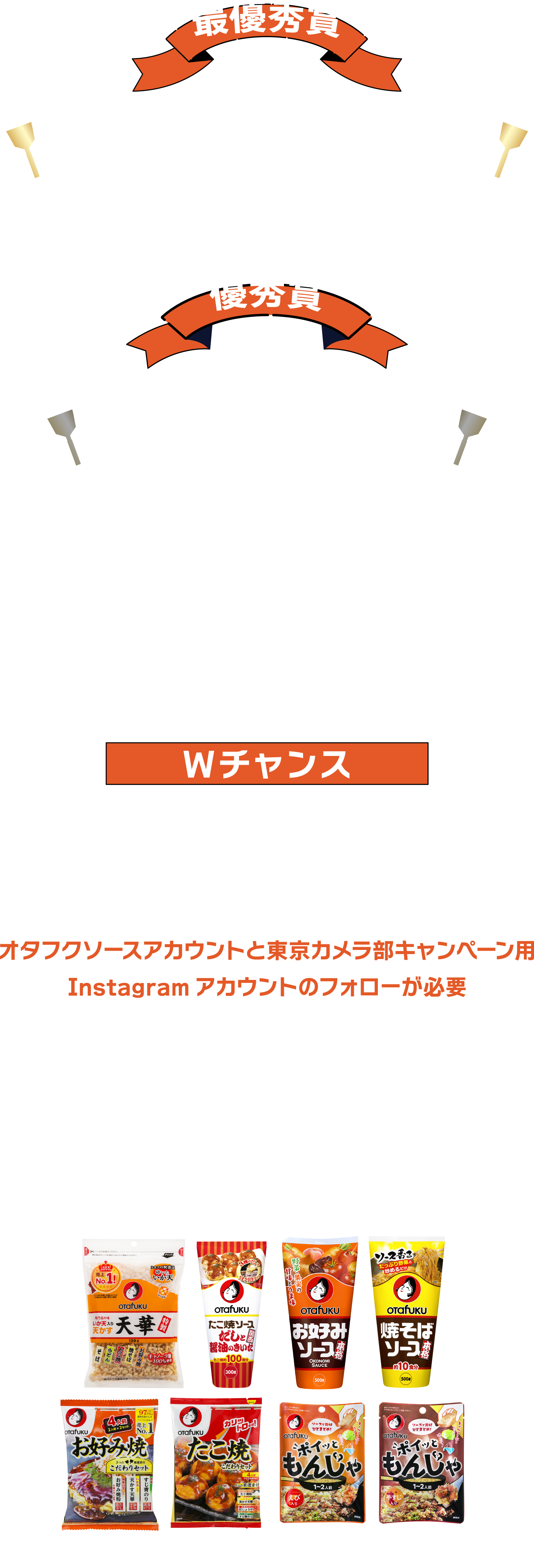 ※受賞作品に限らず、応募作品やそのコメント等は、「オタフクソース」公式Instagramアカウント (@otafuku_sauce)、キャンペーンサイト、店頭販促物、各種広告、「オタフクソース」公式Xアカウント(@Otafuku_s)、関連サイトおよび関連媒体、東京カメラ部等でも紹介させていただく場合があります。その際、トリミングやコメント等の一部抜粋をさせていただく場合がございますことをご了承ください。できる限り事務局からご連絡させていただきます。